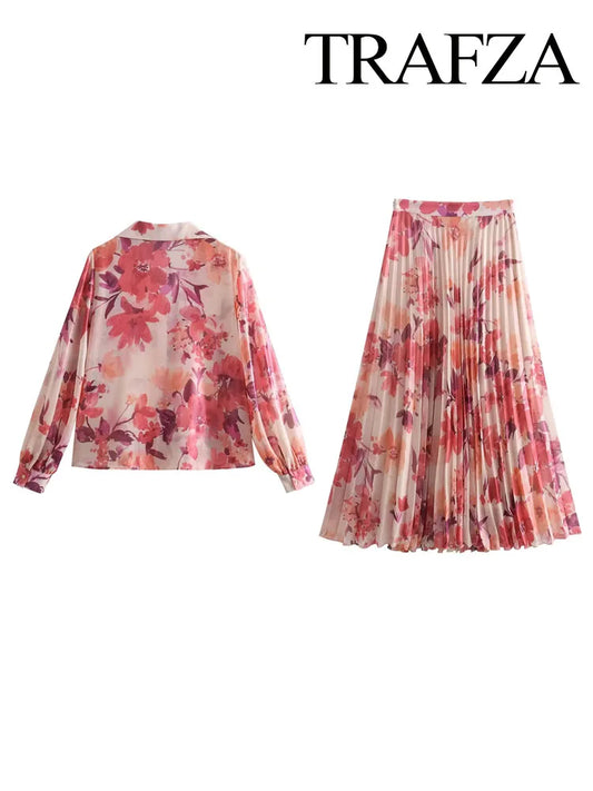 TRAF Tie Dye Skirt Set 2025 Women's 2 Pieces Long Sleeve Shirts Mid Waist Midi Skirt Fashion Casual Elegant Skirt Set Outfit